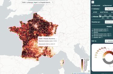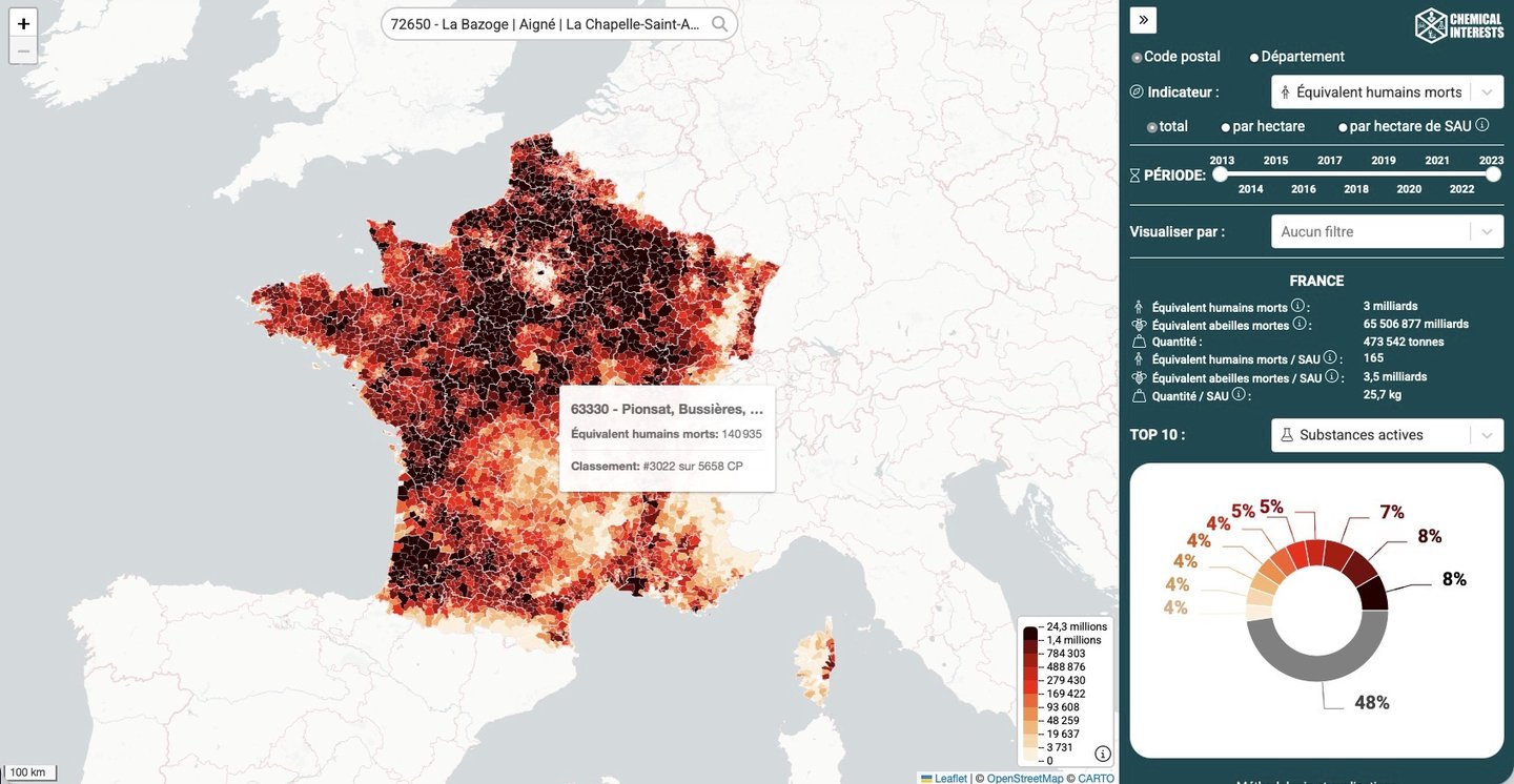 Carte interactive des achats de pesticides de synthèse de 2013 à 2023, par code postal, avec évaluation de la TOXICITÉ et des MODES D'ACTION, en valeur absolue cumulée, mais aussi par hectare et par hectare de Surface Agricole Utile (SAU) hors prairie hors surface biologique, et enfin par substances actives, par produits, par fabricants et en quantité.