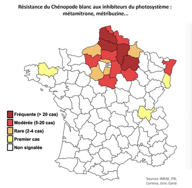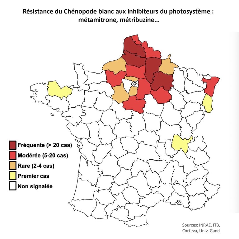 L’Arroche étalée (Atriplex patula) et le chénopode blanc (Chenopodium album), affectant la betterave à sucre (Beta vulgaris), sont devenus résistants aux herbicides (désmédiphame, phénmédiphame, métamitrone et métribuzine).