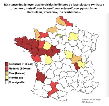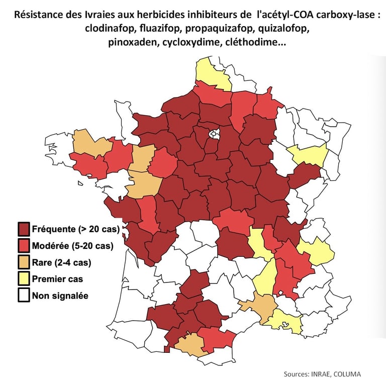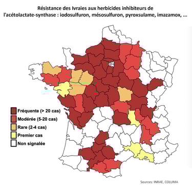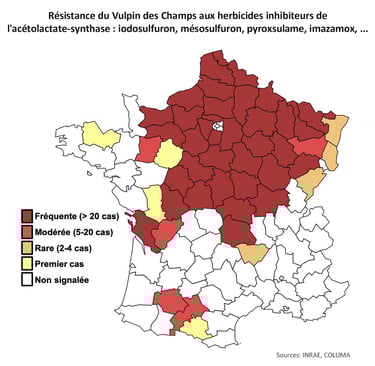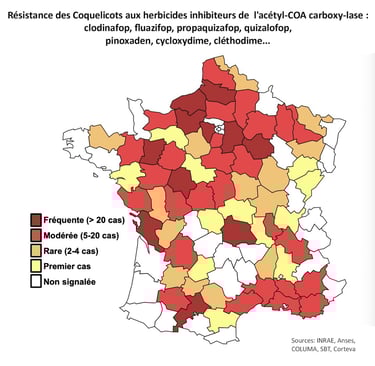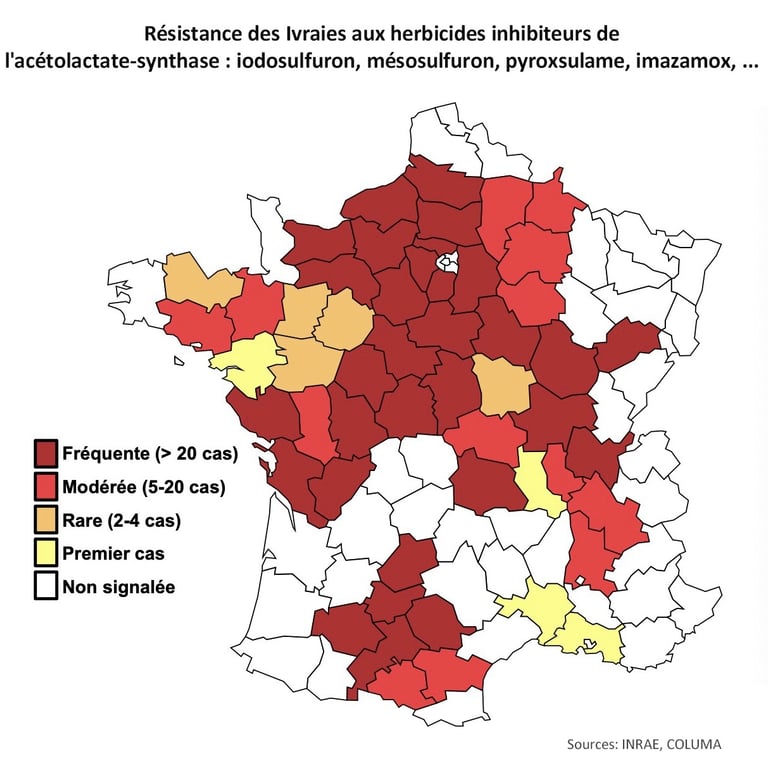 Les Folles avoines (Avena sterilis & Avena fatua) et le Bromus stérile (Bromus sterilis), sur le blé, montrent une résistance aux herbicides (sulfonylurées, mésosulfuron, iodosulfuron et aux triazolopyrimidines, pyroxsulame).