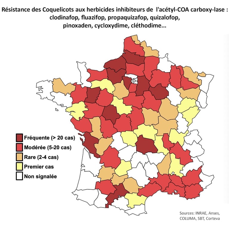 Le Vulpin (Alopecurus myosuroides) et l’Agrostis jouet-du-vent (Apera spica-venti), dans le colza (Brassica napus) et le blé (Triticum aestivum), sont maintenant résistants aux herbicides (quizalofop, prop-quizalofop, fluazifop, fénozaprop, clodinafop, cycloxydime, clétodime et pinoxadène).