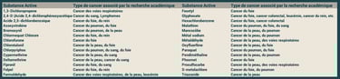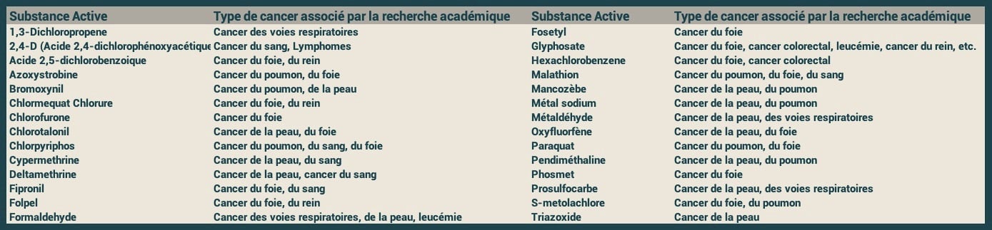 La littérature scientifique, consolidée par plusieurs rapports collectifs, établit des liens de plus en plus solides entre certaines familles de pesticides et divers types de cancers. Le rapport d’expertise collective publié par l’INSERM en 2021, qui repose sur l’analyse de plus de 5 300 articles scientifiques, conclut à une présomption forte de lien entre l’exposition professionnelle aux pesticides et plusieurs cancers. D'ailleurs depuis 25 ans, plus de 700 substances ont été interdites pour protéger la santé des Européens. Le Centre international de recherche sur le cancer (CIRC) a classé plusieurs pesticides parmi les cancérogènes. De nombreuses études ont montré que les agriculteurs, les viticulteurs et les personnes vivant à proximité de zones agricoles présentaient des taux plus élevés de cancers, notamment des cancers du sang (leucémies, lymphomes, myélomes multiples), des cancers hormonodépendants (seins, prostates, testicules), des tumeurs cérébrales. Ci-dessous quelques exemples: