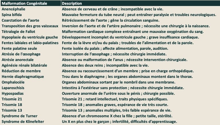 C'est surtout une exposition entre la semaine 3 et 8 que les anomalies morphologiques majeures interviennent et pendant tout le reste de la grosses pour les anomalies mineures. Les anomalies congénitales affectent environ 3 à 4% des naissances et sont une cause importante de mortalité périnatale et infantile, de morbidité et de handicaps, avec une part importante de formes graves, souvent non viables.